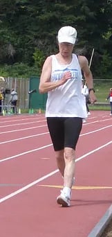 All Bev’s work for racewalking would have been a full time job for most normal people but Bev integrated all this around her family, and work, and by the way, training for competition that led to record setting performances and victories. Bev was also the National Masters verifier and records keeper for racewalk records and I guess she wanted to make the job easier by having her own name in the record books so many times. At latest count, she holds 18 track and road racewalk records, from 3K to 100K. I know there may be a few other distance records out there in her name that didn’t make the official lists. Some of these performances came during National and International Masters championships, which Bev attended regularly. I know she has numerous medals at these events, the total number of which we may never know as I doubt even she kept that close a track as she was always looking forward to the next event.